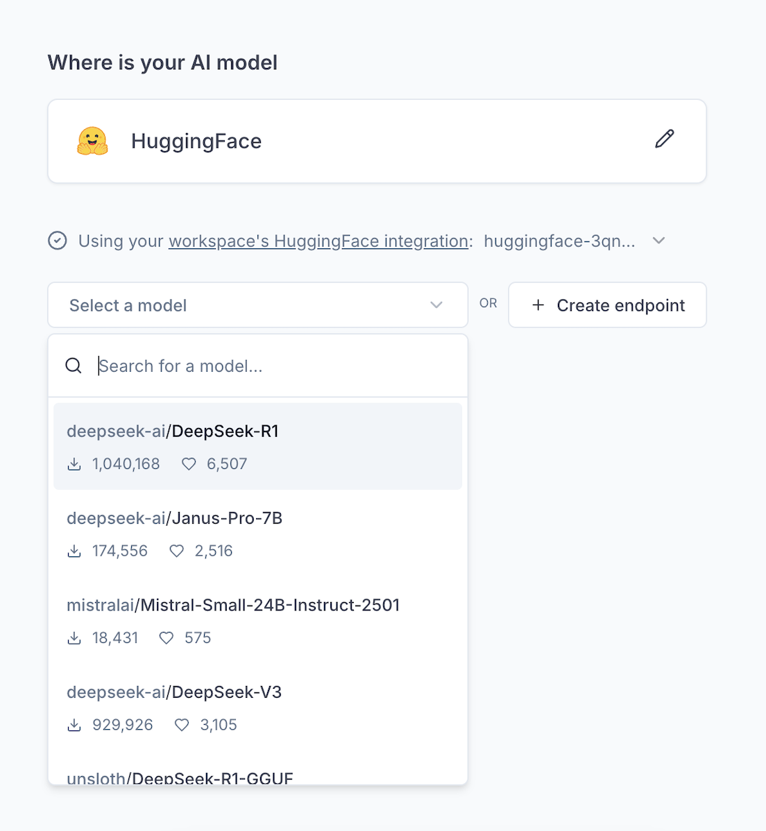 - Connect to public or private models from HuggingFace Inference API (serverless) and Inference Endpoints (dedicated)