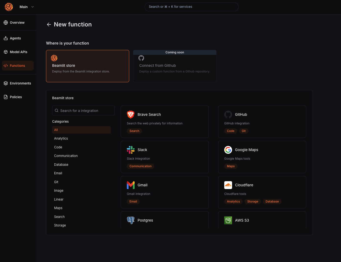 - Functions: run serverless functions that provide your agents with the tools to interact with their environment