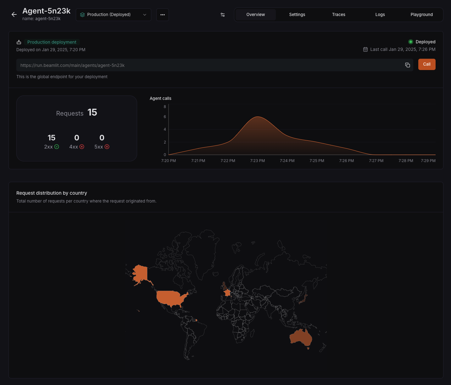 - World map showing the origin of requests on your agents AI