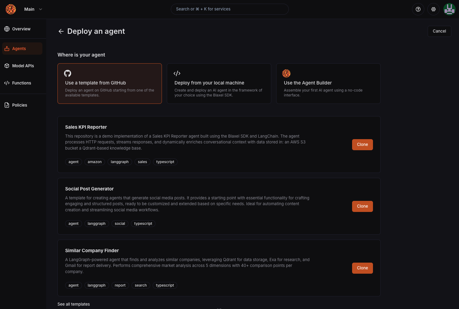 - Templates can be used when creating a new agent from the Blaxel Console. Deploying a template will deploy the agent on your GitHub organization and setup a live synchronization watching future updates
